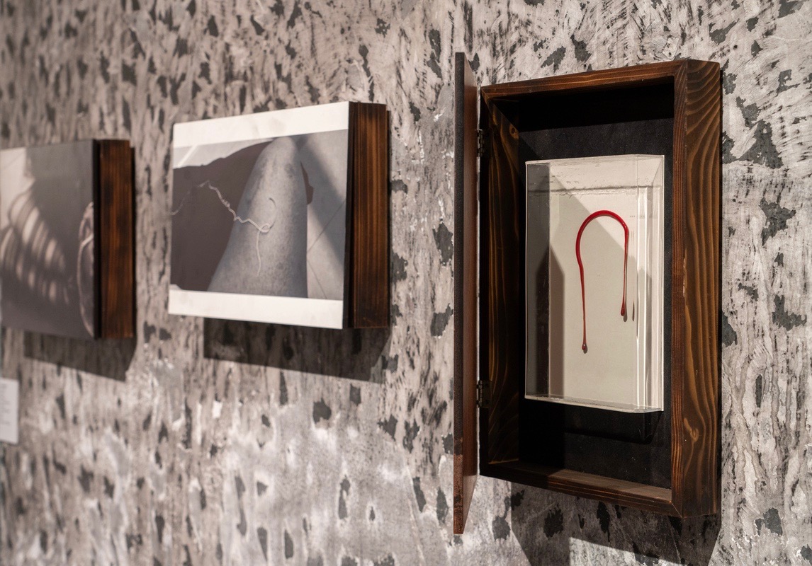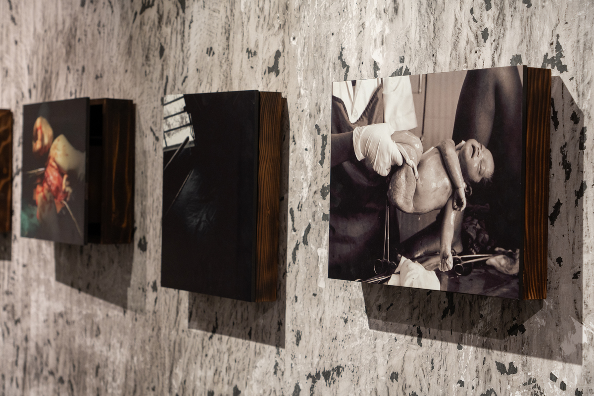 There’s a rhythm to how the dynamic of relationships gets played out in the hospital space. Like family members, Mistri assumes the role of a confidante, a listener to the woes, injustices and happinesses of her women subjects. Mistry’s practice includes churning out the memories from the objects that inform her subjects’ living processes. Bottles of blood, placentas, scissors, stretchers and machines serve as symbols of the mechanised nature of the medical arena. To capture such images is itself an act of revelation to the artist whose personal experience with childbirth and healthcare systems marks her intervention with the photographs in terms of painting and found objects being juxtaposed with each other housed in cabinet-like structures. The hiding and revealing acted out through the cabinet doors work towards an interactivity and performativity that generates curiosity in the viewer to find the hidden memory that could be a photograph or an object resounding the unpredictability that plays out within the process of child-birth.